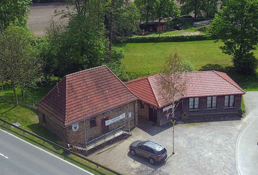 Das Wappen erinnert an die Rodung - ein schwarzer Baumstumpf ist auf goldenem und blauem Schild abgebildet.